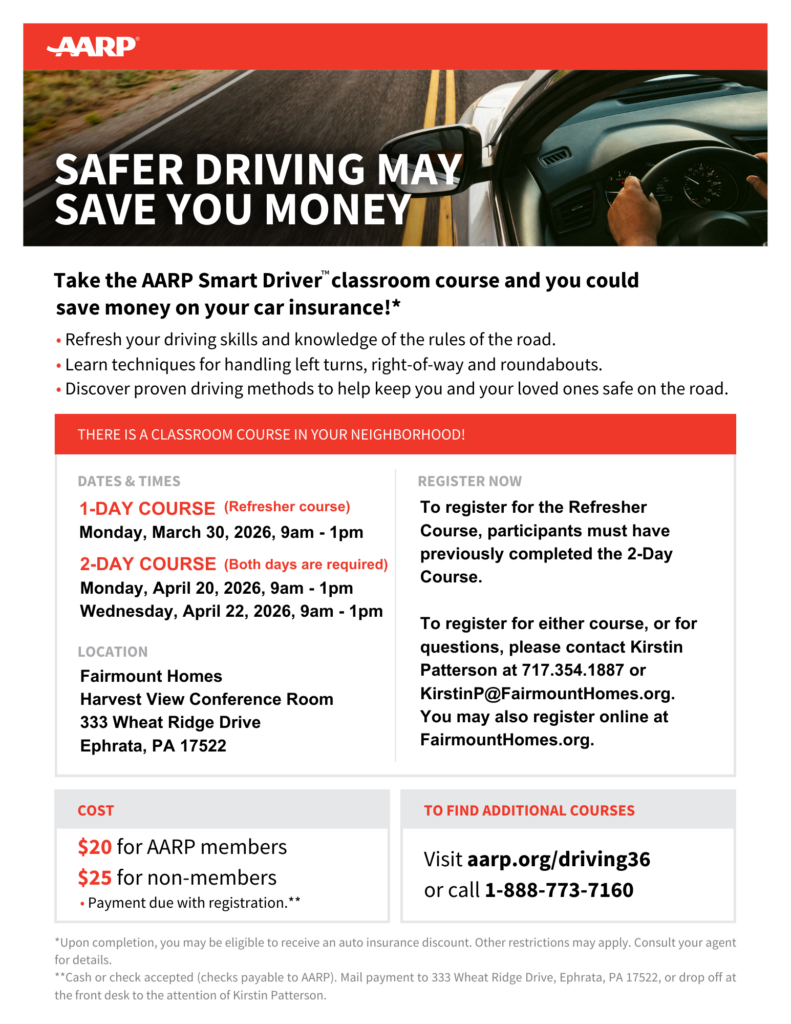 Fairmount Homes will offer two AARP Smart Driver™ classes in 2026, designed to help drivers refresh their skills, stay safe on the road, and potentially save money. These classes are open to Fairmount Homes residents, team members (when attending off the clock), and community members. The 2-Day Classroom Course will be held on Monday, April 20, and Wednesday, April 22, from 9:00am to 1:00pm (attendance is required both days). In addition, a 1-Day Refresher Course will be offered on Monday, March 30, from 9:00am to 1:00pm; please note that participants must have previously completed the 2-Day Course in order to register for the refresher. Upon successful completion of either course, drivers may be eligible for up to a 5% discount on auto insurance, depending on their provider. Classes will be held at Fairmount Homes in the Harvest View Conference Room. Advance registration and payment are required.