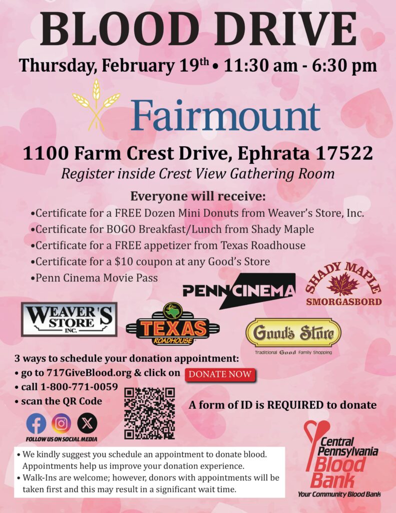 The Central PA Blood Bank’s Community Blood Drive is planned at Fairmount for Thursday, February 19, from 11:30am to 6:30pm. Registration for the blood drive will be held inside the Crest View Gathering Room at 1100 Farm Crest Drive on the east side of the Fairmount campus. You may schedule an appointment by calling 1.800.771.0059. Walk-ins are welcome until 6:00pm, but scheduled appointments will be given priority. Please bring a photo ID with you when you come to donate.