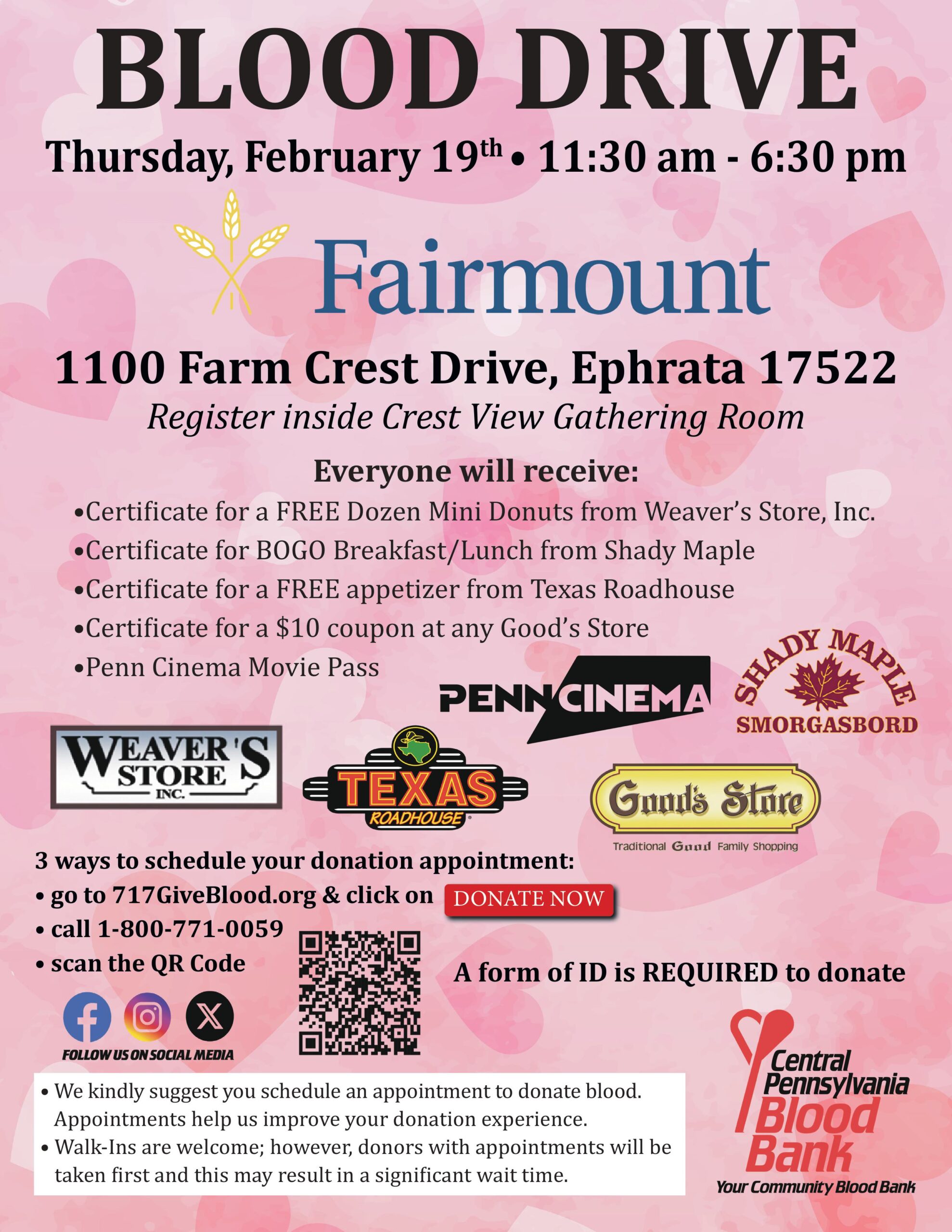 All donors will receive a certificate for a FREE dozen mini donuts from Weaver’s Store, a certificate for BOGO free breakfast/lunch from Shady Maple, a certificate for a free appetizer from Texas Roadhouse, a $10 gift card to any Good’s Store, and one Penn Cinema movie pass.