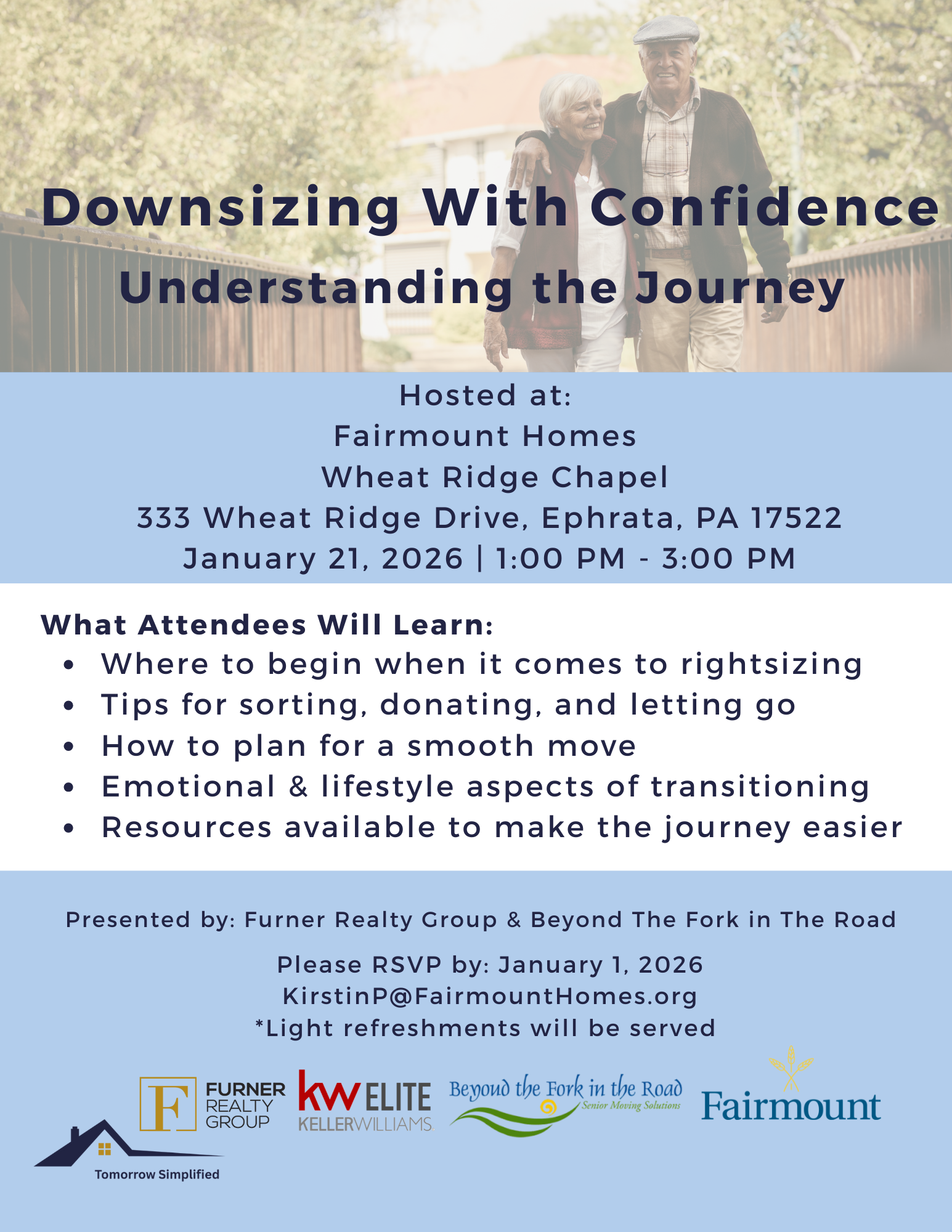 Furner Realty Group and Beyond the Fork in the Road will be presenting “Downsizing with Confidence: Understanding the Journey” at Fairmount Homes on Wednesday, January 21, 2026, from 1:00pm to 3:00pm. The seminar will be held in the Wheat Ridge Chapel at 333 Wheat Ridge Dr. on the west side of the Fairmount campus. This educational seminar is free, but registration is requested by January 1, 2026.